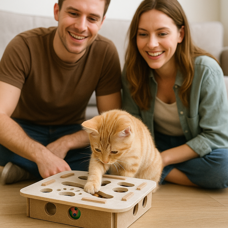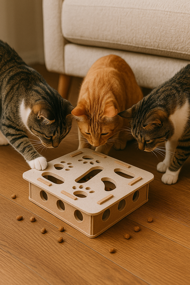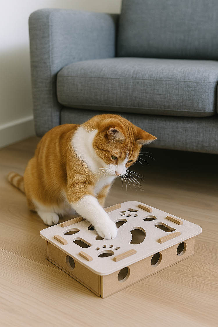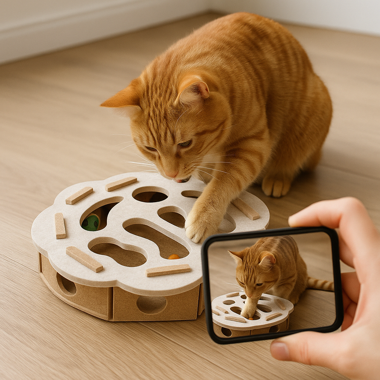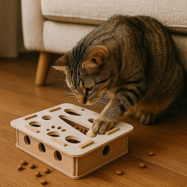 Vul de puzzel met brokjes of snacks → je kat moet hengelen, duwen en nadenken → hij wordt beloond met een hapje of speeltijd.