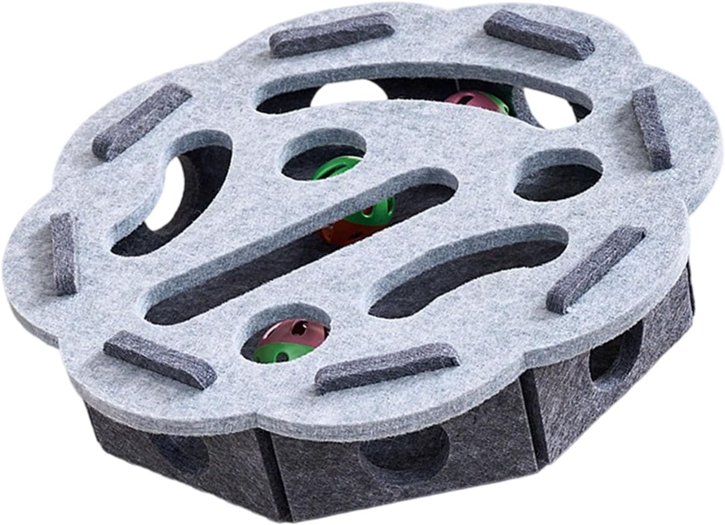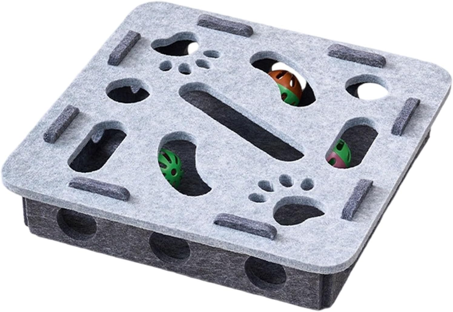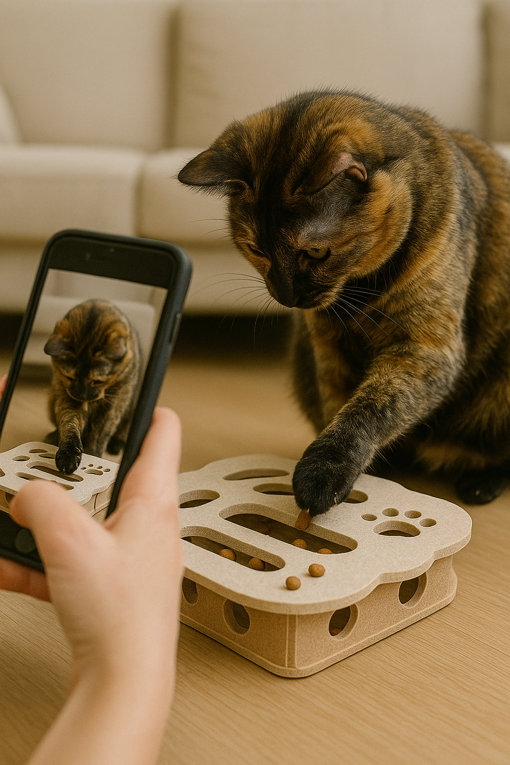 Vul de puzzel met brokjes of snacks → je kat moet hengelen, duwen en nadenken → hij wordt beloond met een hapje of speeltijd.