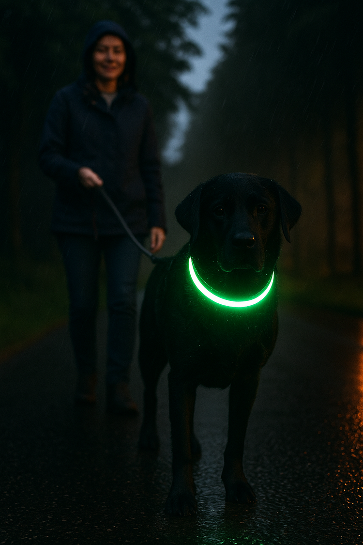 Donkere of langharige honden verdwijnen visueel. Een clip-on is een spotje; reflectie werkt pas laat. Een gesloten licht-ring rondom de nek geeft 360° conspicuity — ook van opzij en achter — en blijft zichtbaar door vacht, miezer en mist. Luxbie ZieMij 360 is “waterklaar” ontworpen voor Nederlandse avonden: regen, nat gras, modder. Knippen op maat? Ja: knip-markeringen + past-altijd gemak.