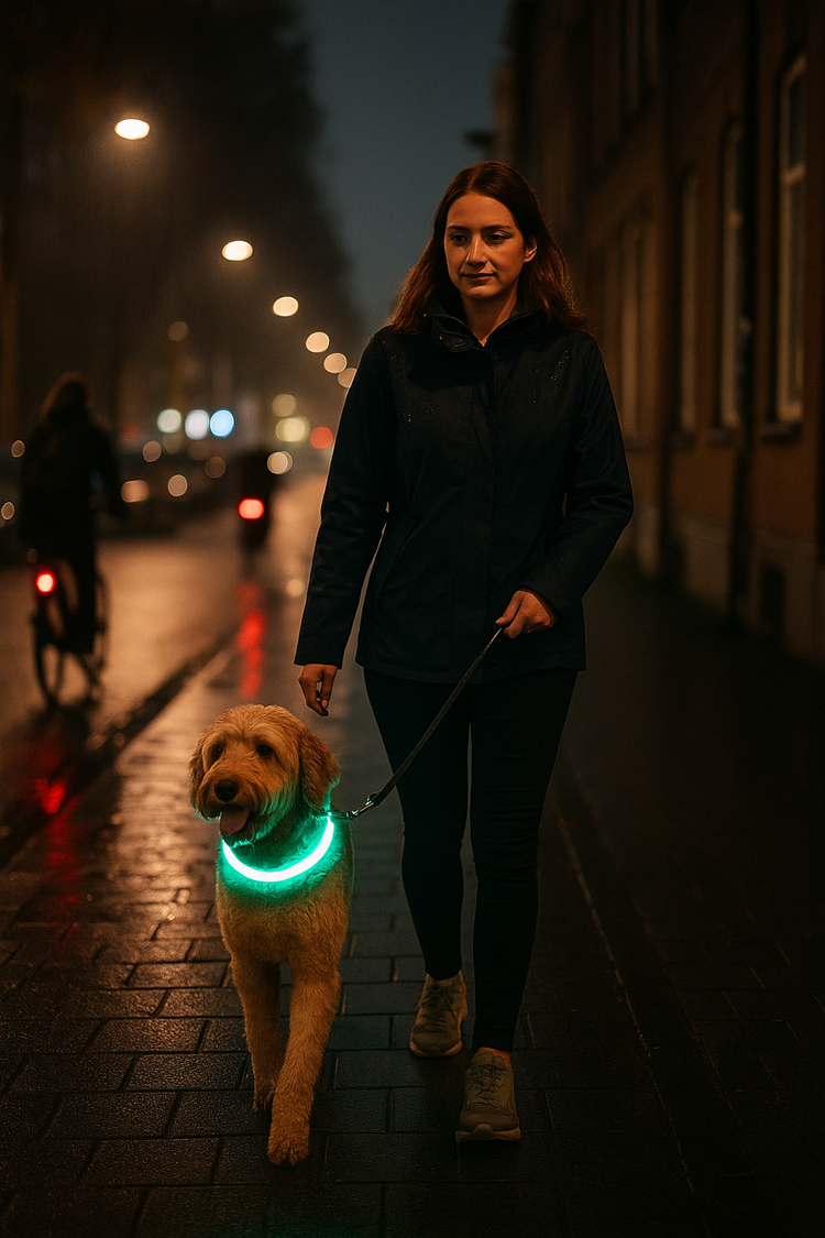 Ja — de halsband is ontworpen voor Nederlandse avonden: regen, nat gras en modder horen erbij. We communiceren eerlijk over waterbestendigheid en tonen dit met bewijs; na gebruik kort afspoelen en drogen verlengt de levensduur. (Vermijd langdurige onderdompeling.)